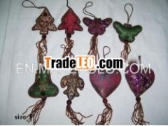 HANGING TREE , CROSS, STAR, BUTTERFLY, HEART WITH ZARI WORKEMBROIDERY ON SINGLE SIDE FABRIC. INSIDE FOAM .TASSEL HANGING ATbase.